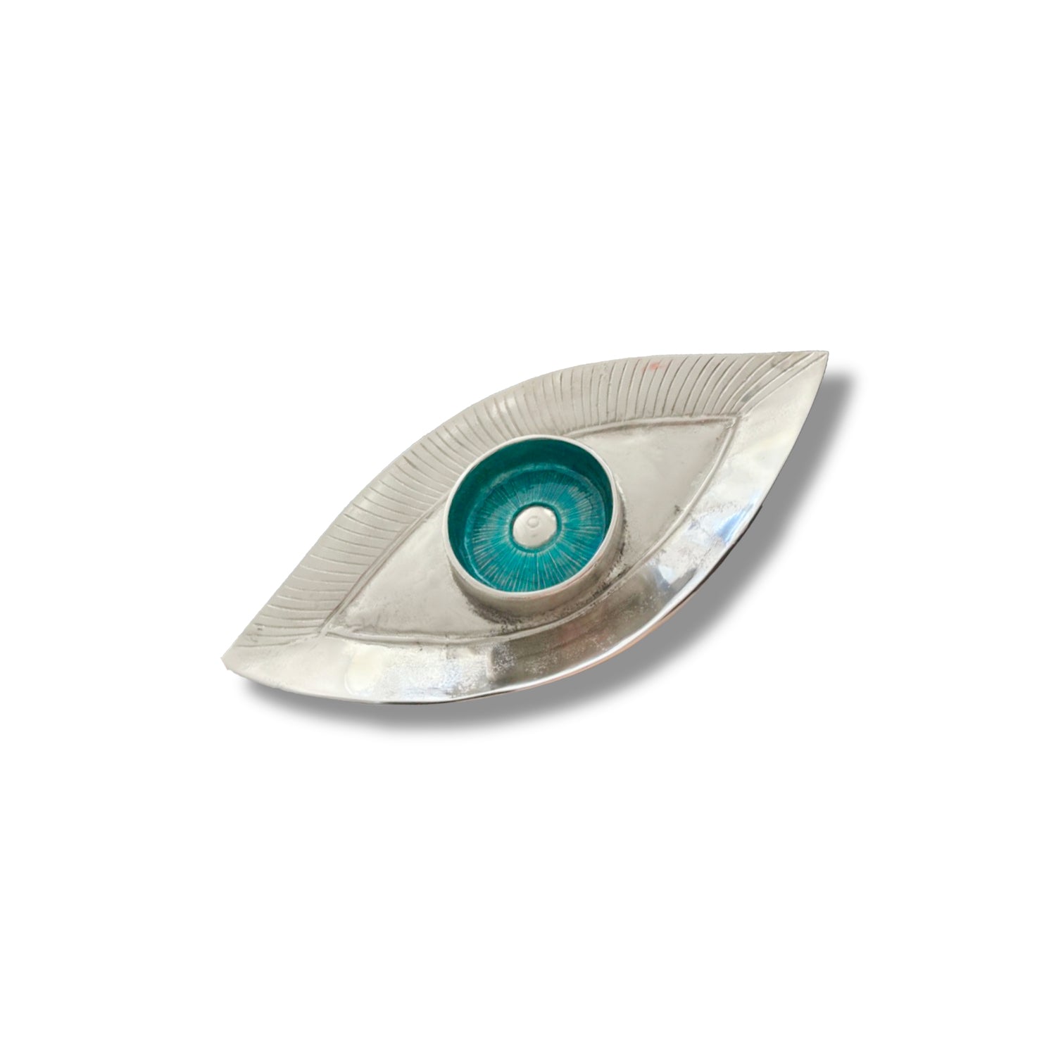 Alrededor del "ojo" central, en la superficie del metal plateado, hay grabados o relieves que simulan las líneas de las pestañas o los pliegues del párpado, lo que refuerza la temática del ojo. El diseño es moderno y llamativo, combinando la estética del metal con el vibrante color de la incrustación central. Es una pieza que puede servir tanto para decoración como para contener pequeños objetos.