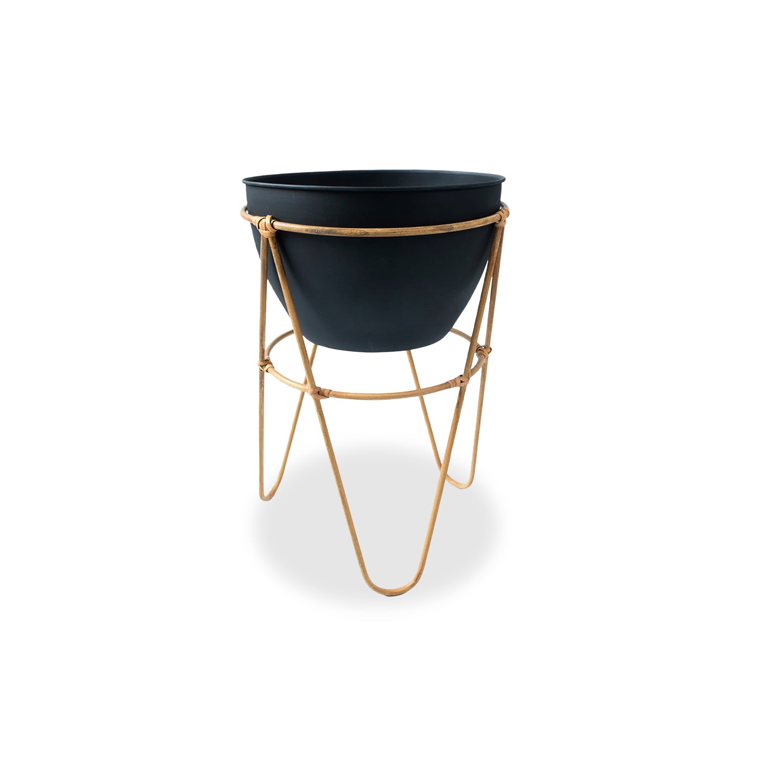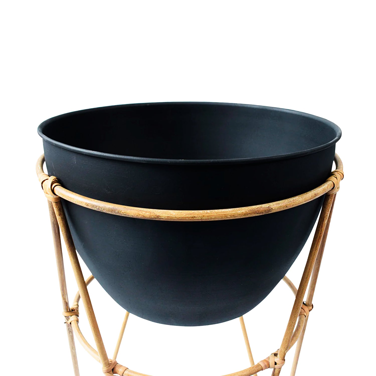 Matera con base en palos de bamboo, y base negra. Esta matera es ideal para usar en el patio o jardín,  tus flores serán las protagonista de tu decoración.