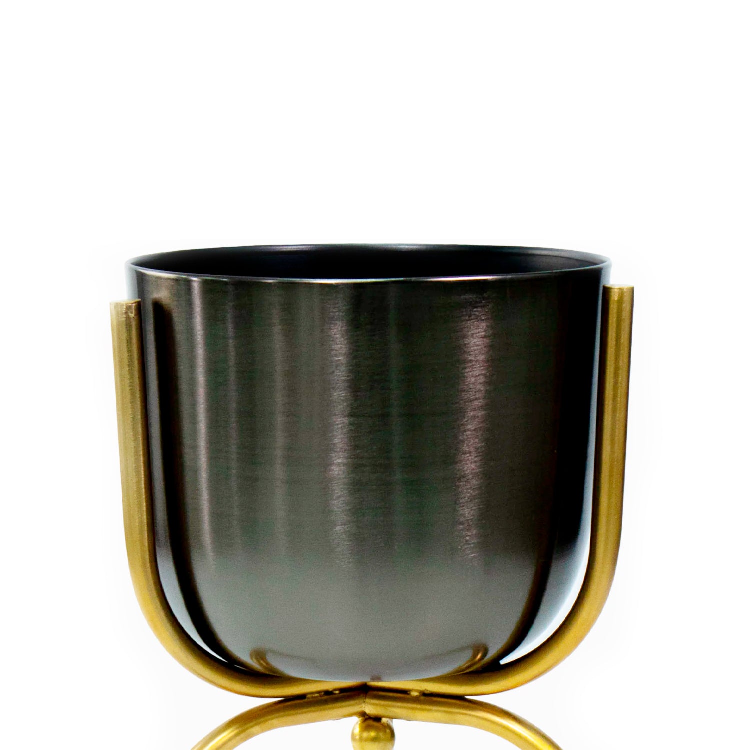 Matera metálica color negro con base dorada, este accesorio lo puedes usar también como centro de mesa o simplemente de decoración para el patio o jardín.