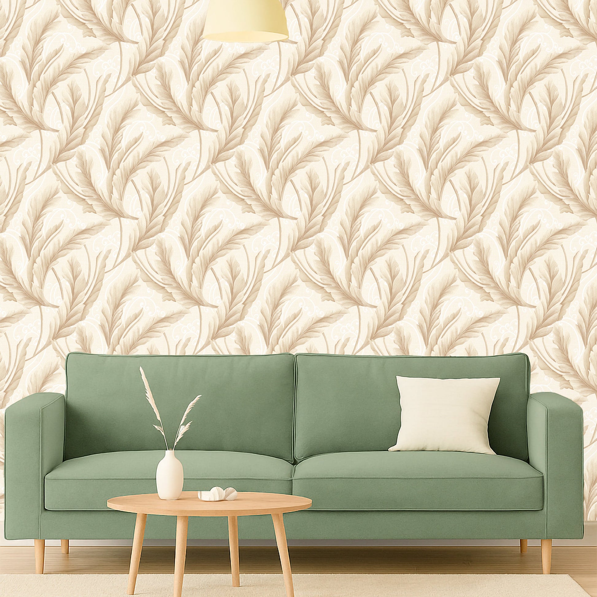 El papel tapiz de la imagen presenta un diseño de hojas entrelazadas en una variedad de tonalidades. El fondo es de un crema y tonalidades cafés claras y oscuras el combinación con dorado con un acabado texturizado sutil, que le da profundidad.