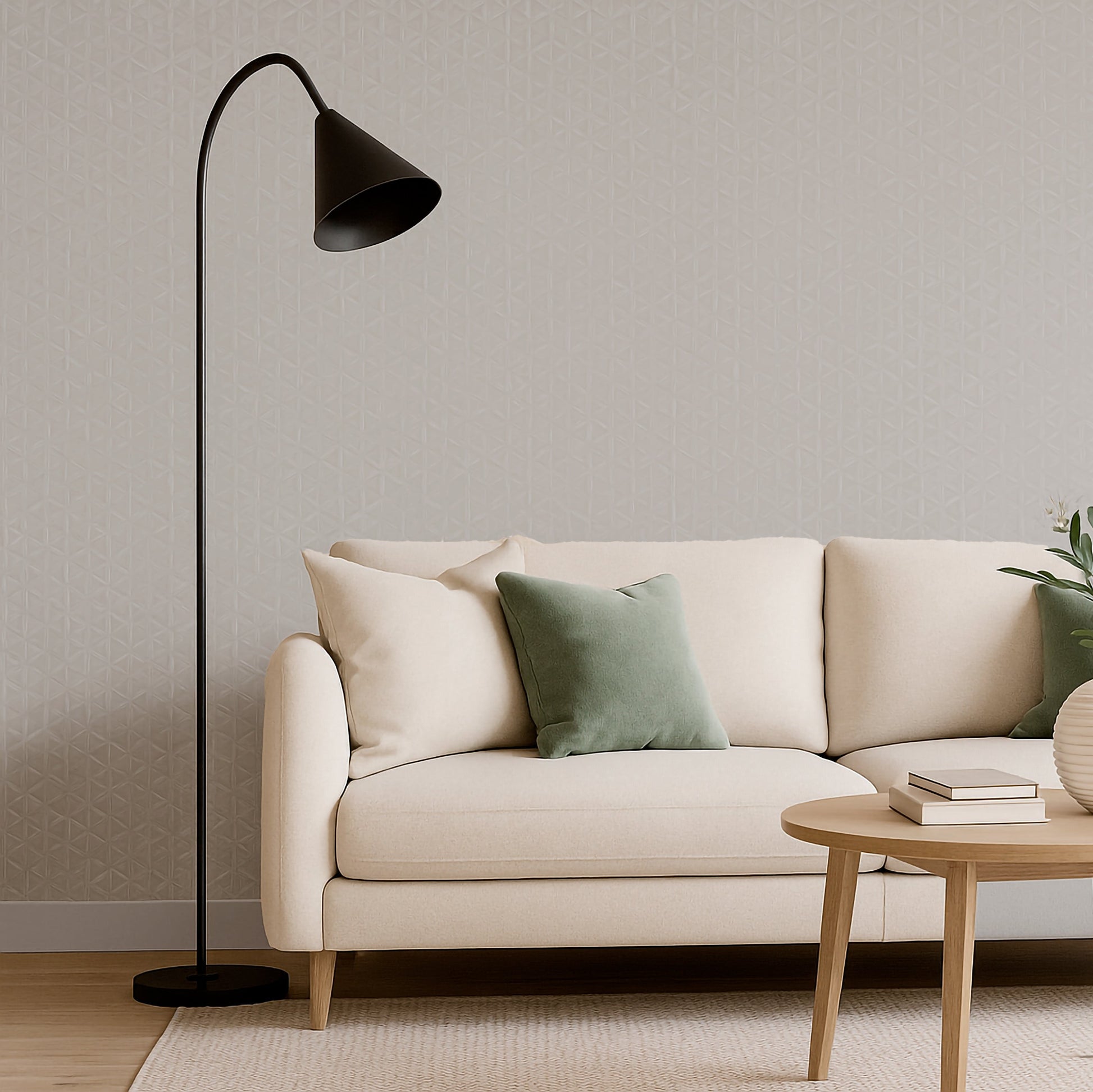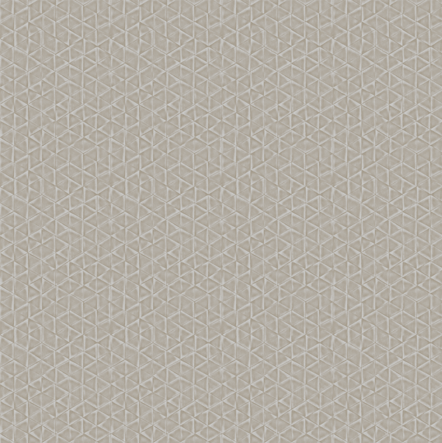 El papel de colgadura tiene un diseño geométrico sutil y delicado. El fondo es de un color  gris claro, y el patrón consiste en una red de triángulos o formas poligonales que se entrelazan. El diseño es discreto y minimalista, creando una textura visual ligera que añade interés sin abrumar el espacio