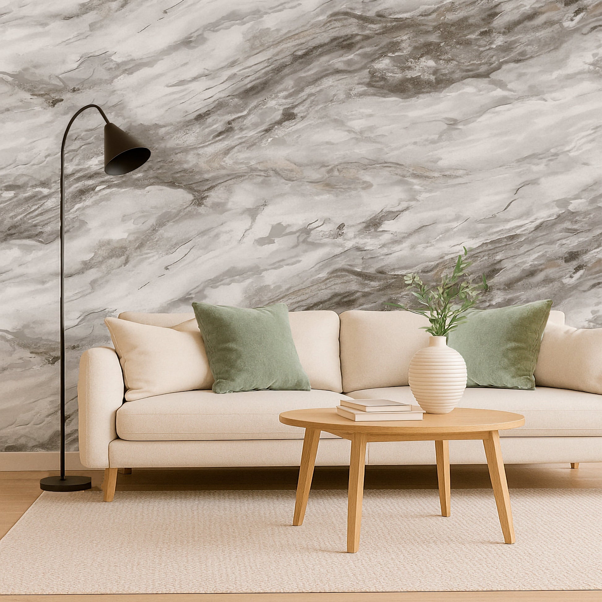 Este papel de colgadura tiene un diseño de mármol con vetas marrones y grises sobre un fondo blanco y cremoso. La textura parece ser suave, y las vetas varían en grosor y oscuridad, creando un efecto de movimiento y profundidad que da la impresión de ser una piedra natural