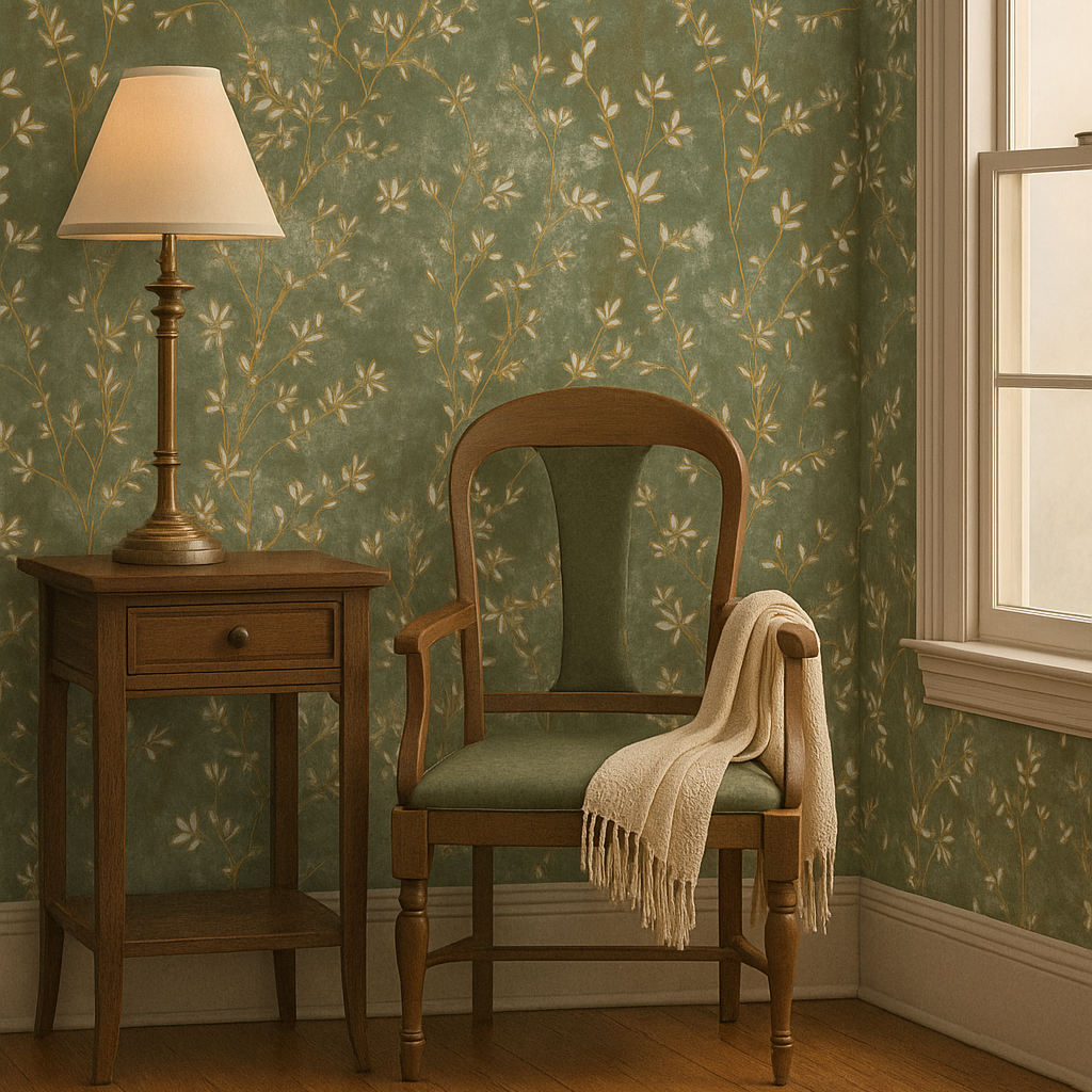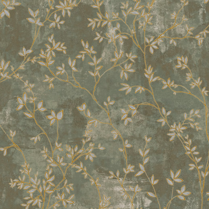 El papel tapiz de la imagen presenta un diseño de follaje en tonos que van del verde pálido al marrón claro. Un patrón de hojas pequeñas y ramas finas de color blanco y dorado se entrelaza y sube por toda la pared.