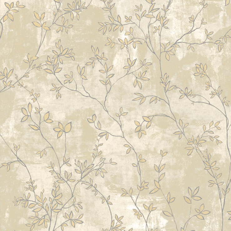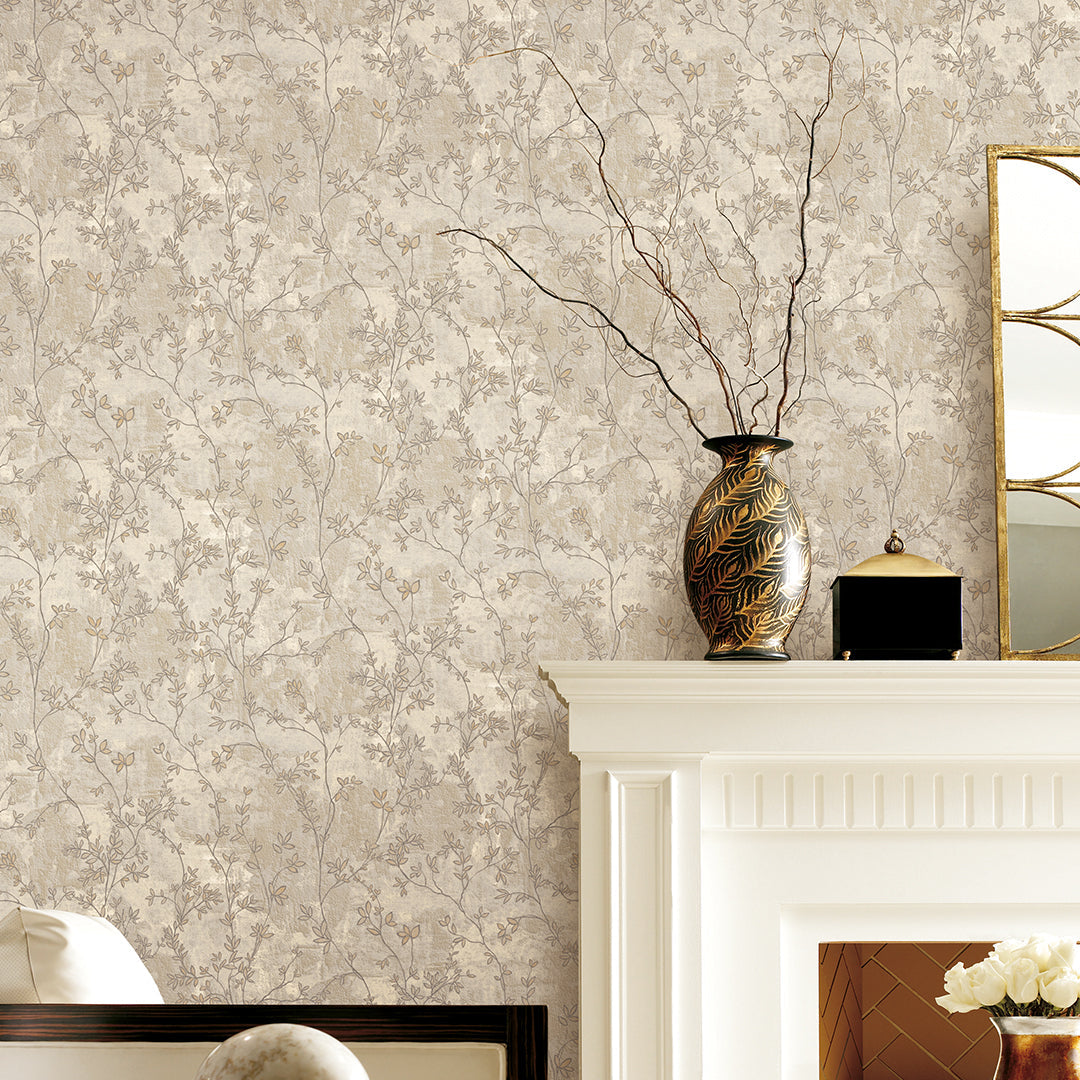 El papel tapiz de la imagen presenta un diseño de follaje en tonos que van del blanco al crema y marrón claro. Un patrón de hojas pequeñas y ramas finas de color blanco y dorado se entrelaza y sube por toda la pared.