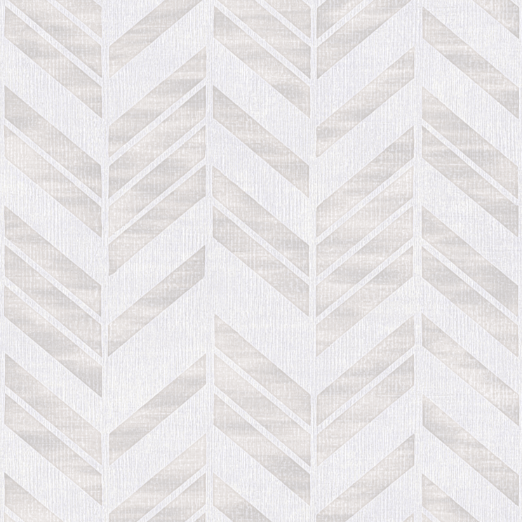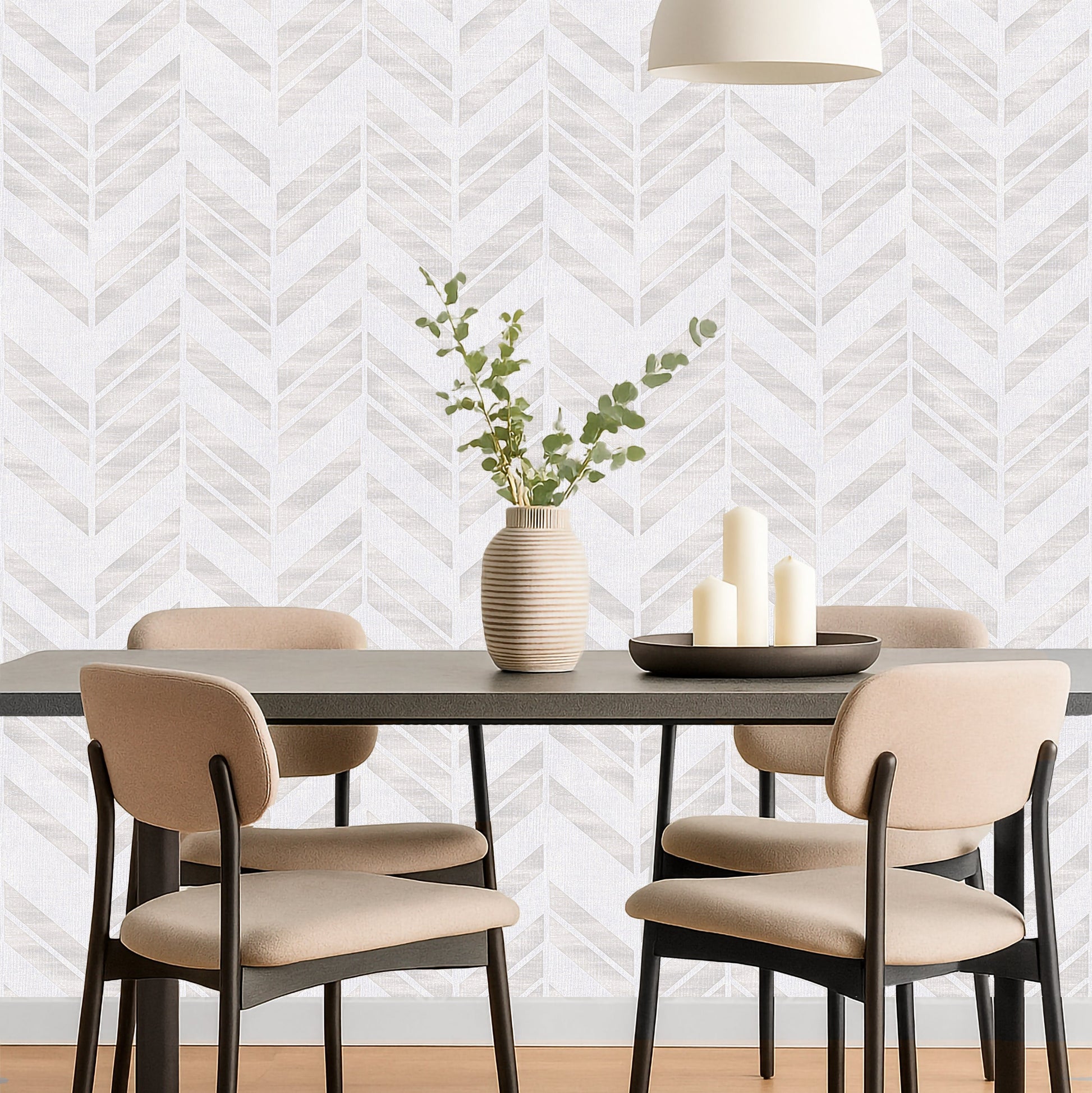 El papel tapiz de la imagen presenta un diseño de chevron o espiga en una paleta de colores neutros, principalmente grises y blanco roto.