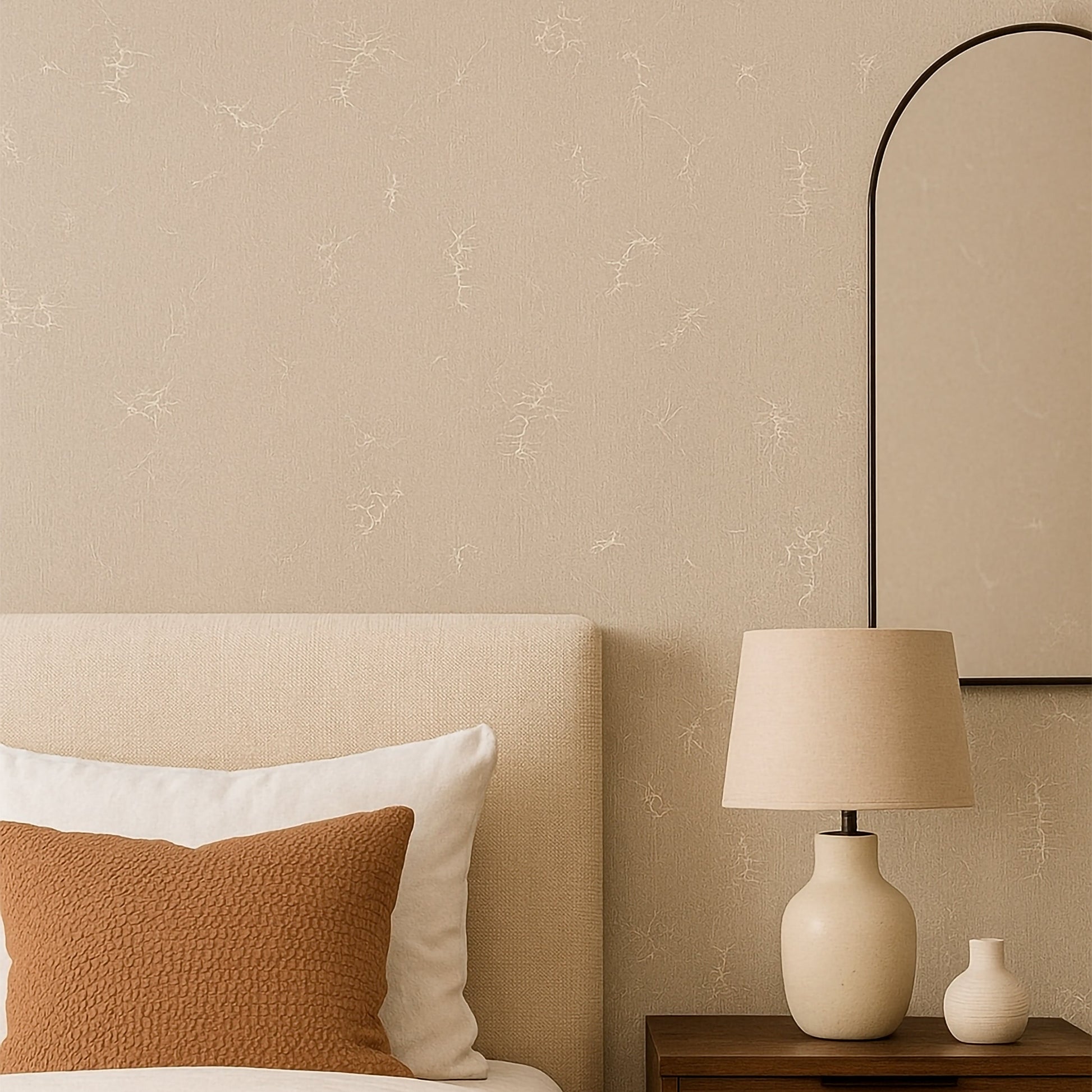 El papel tapiz tiene un color base beige y dorado que es a la vez sereno y sofisticado. Sobre este fondo, presenta un patrón de finas líneas verticales que le dan una textura visual, similar a la del lino o la tela de un traje. Este detalle agrega profundidad a la pared y evita que el color se vea plano.