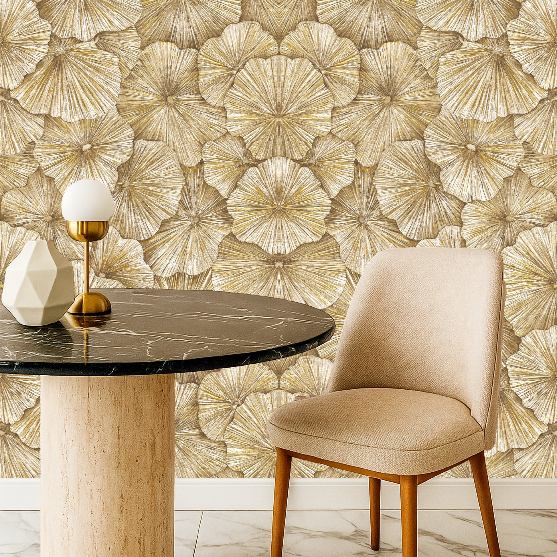 El papel tapiz presenta un patrón repetitivo de formas orgánicas y circulares que se asemejan a flores estilizadas, hojas de abanico, o incluso a la piel de un erizo de mar vista de cerca. Las formas están dibujadas con líneas finas que irradian desde un centro, creando una sensación de movimiento y textura visual.