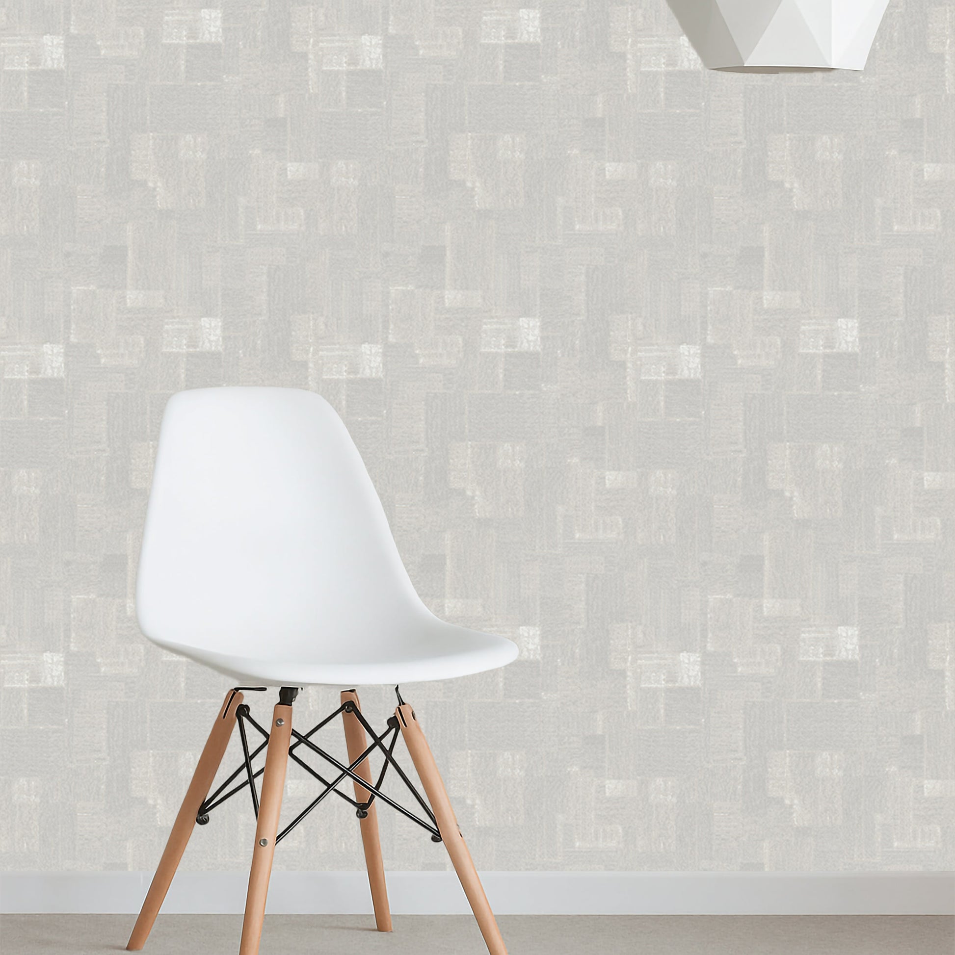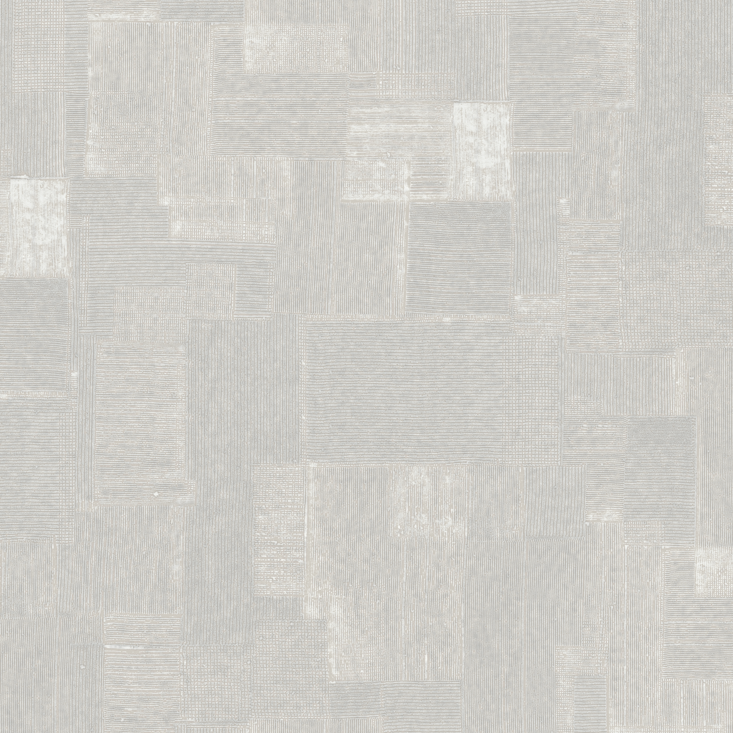 El papel tapiz de la imagen presenta un diseño geométrico con un patrón de cuadros o rectángulos superpuestos. La paleta de colores es muy sutil y monocromática, predominando los tonos blancos y grises