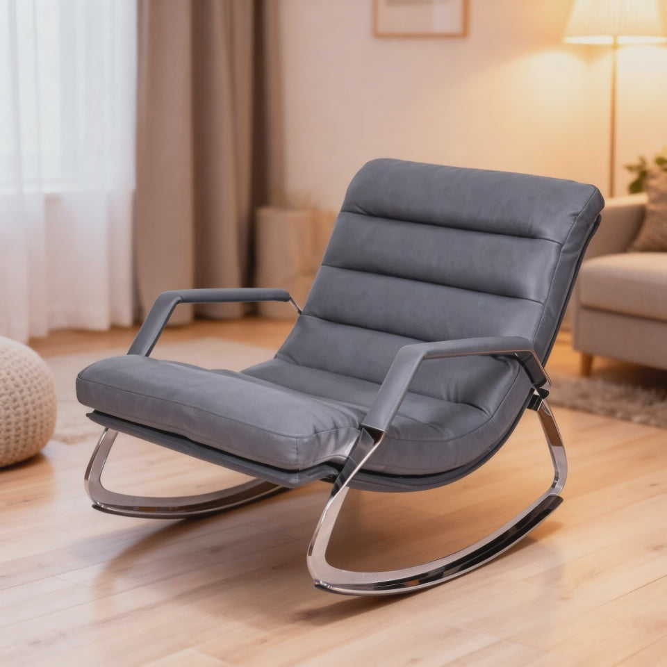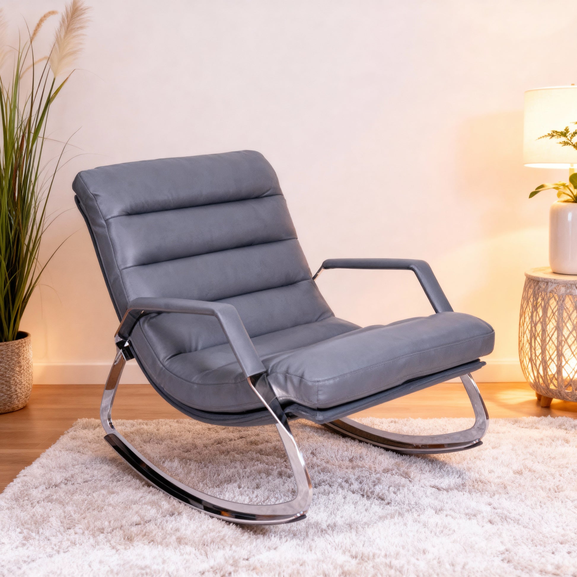 Descubre la combinación perfecta de estilo, confort y funcionalidad con nuestra poltrona mesedora, diseñada para elevar cualquier espacio. Su tapizado en cuero de alta calidad ofrece una textura suave y duradera, mientras que la estructura en acero inoxidable proporciona robustez y un acabado moderno y sofisticado.
