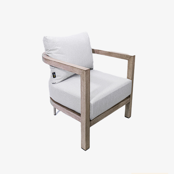 El diseño de líneas limpias y modernas de las piezas, incluyendo la mesa de centro, las poltronas y el sofá de tres puestos, crea un ambiente sofisticado en tu patio o jardín.