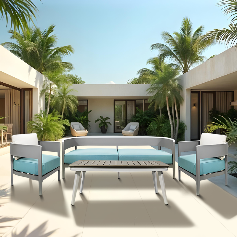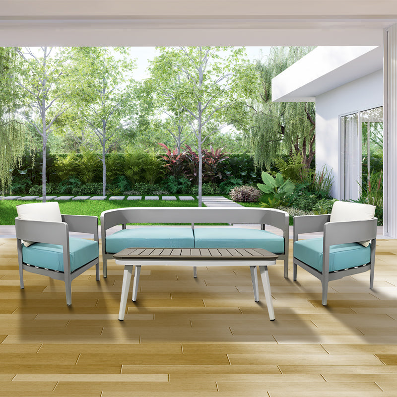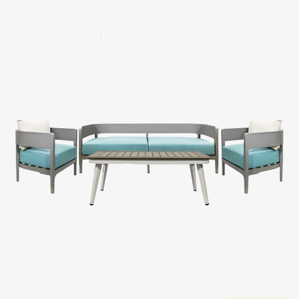 Este juego de sala para exterior combina funcionalidad y estilo en un conjunto armonioso. La combinación de colores, con el gris de la estructura y el azul de los cojines, junto con los detalles en las mesas, crea un ambiente moderno y acogedor en tu área al aire libre, perfecto para relajarte y disfrutar de momentos al aire libre con comodidad y elegancia.