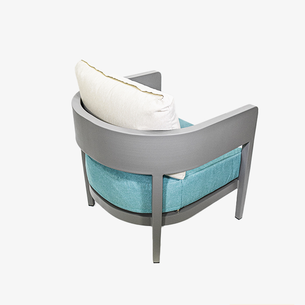 La estructura del sofá de dos  puestos y las dos poltronas está fabricada en aluminio con un elegante acabado en color gris, que proporciona durabilidad y resistencia a la intemperie.