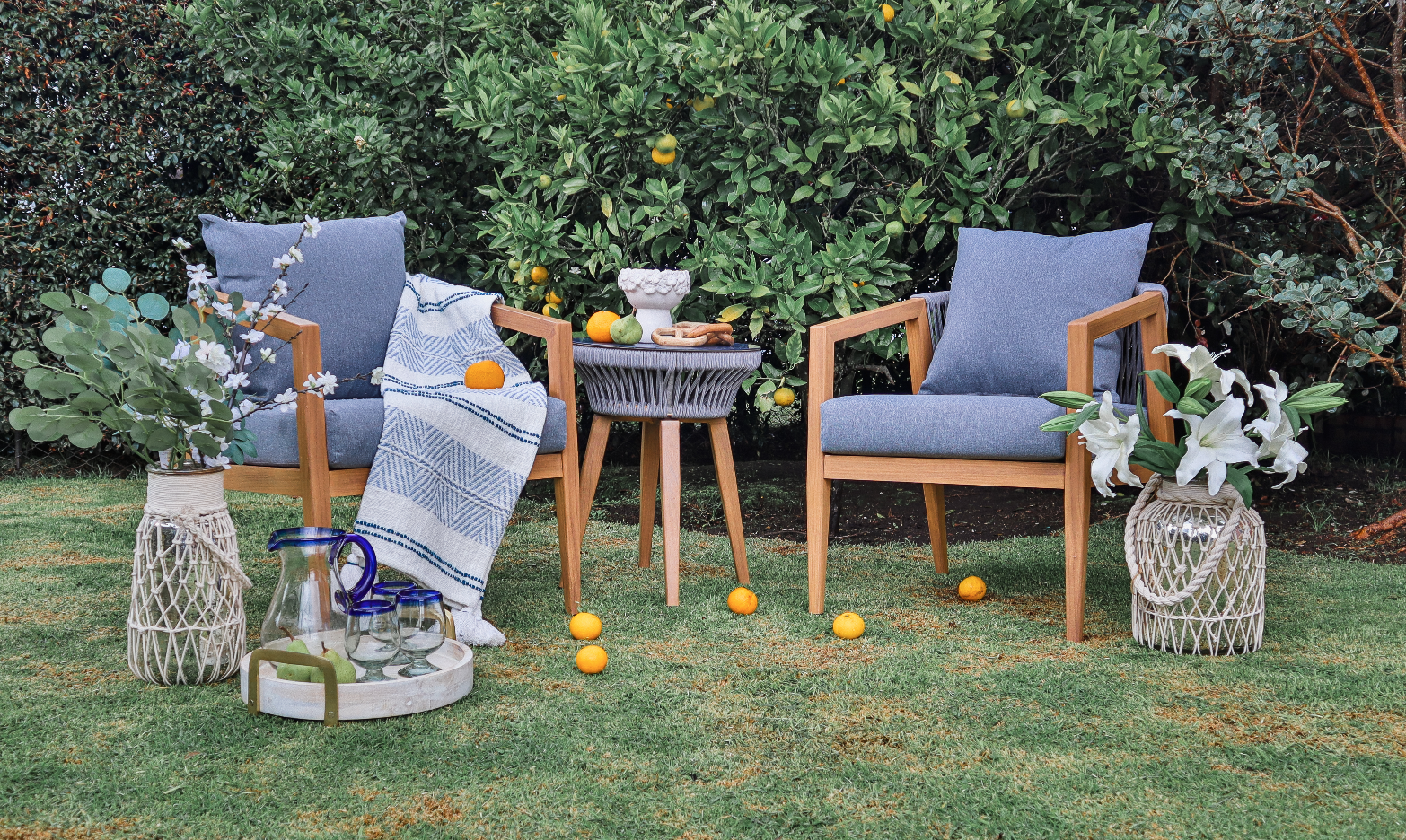 El set incluye cojines en tono gris con tela antifluido, lo que garantiza su resistencia al agua y facilita su limpieza, ideal para su uso en exteriores sin preocupaciones.