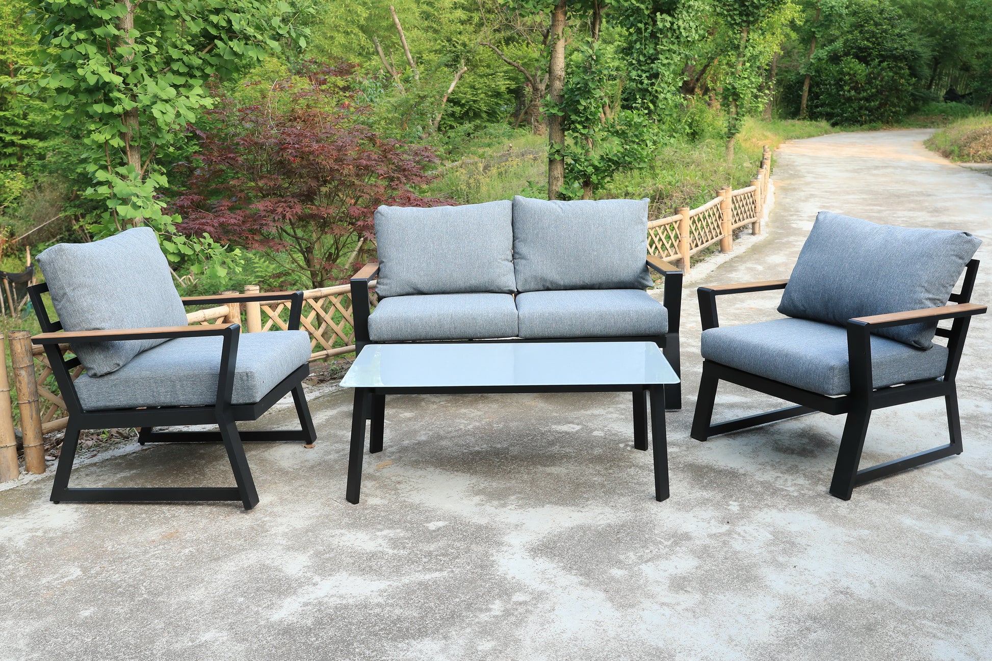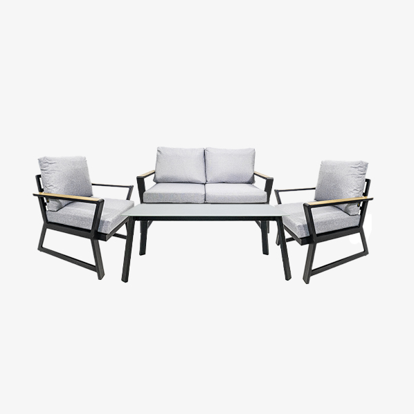Este juego de sala para exterior combina elegancia, confort y funcionalidad en un conjunto equilibrado y atractivo. La combinación del color negro, los detalles en madera y los cojines gris crea un ambiente moderno y acogedor en tu espacio exterior, perfecto para relajarte y disfrutar de momentos al aire libre con estilo.