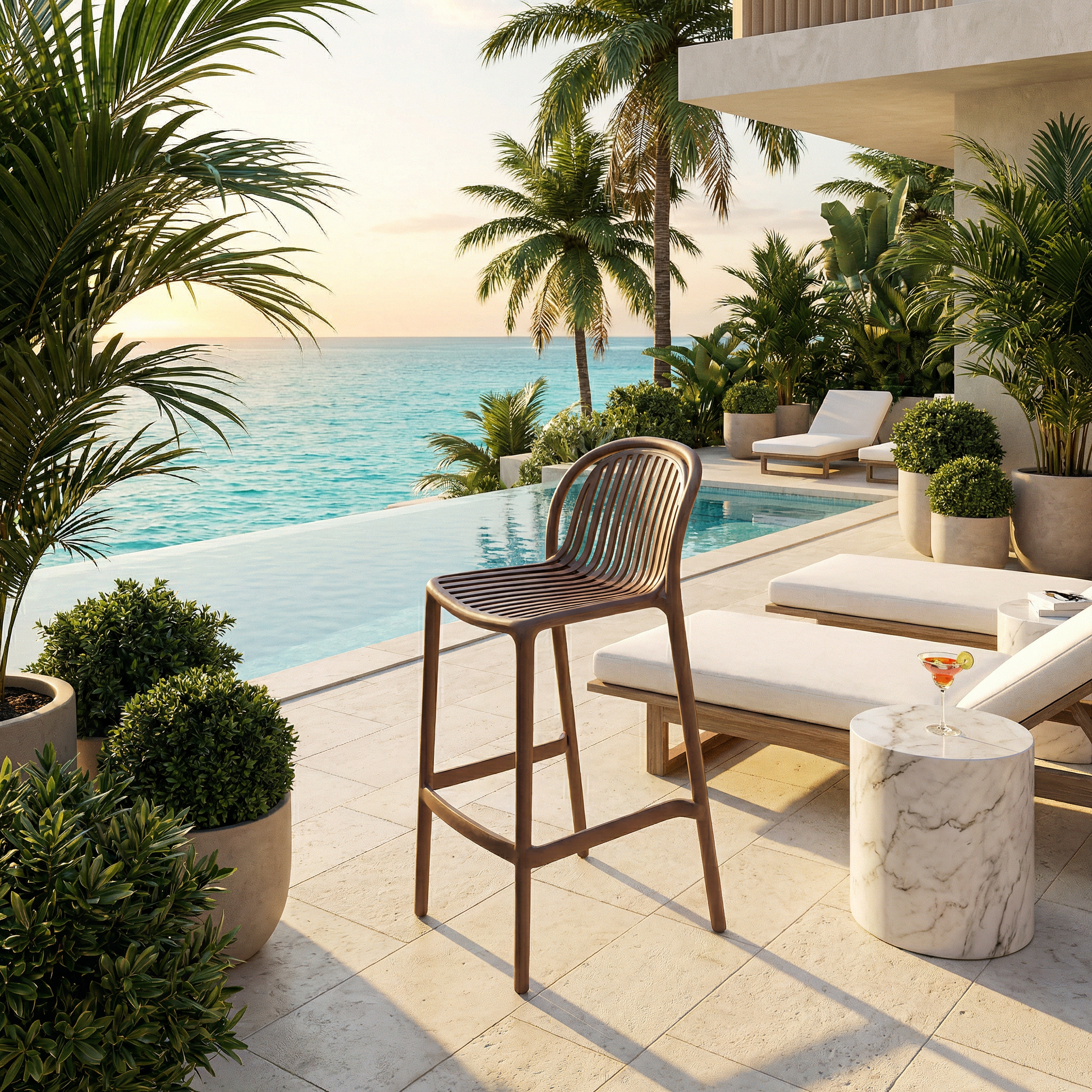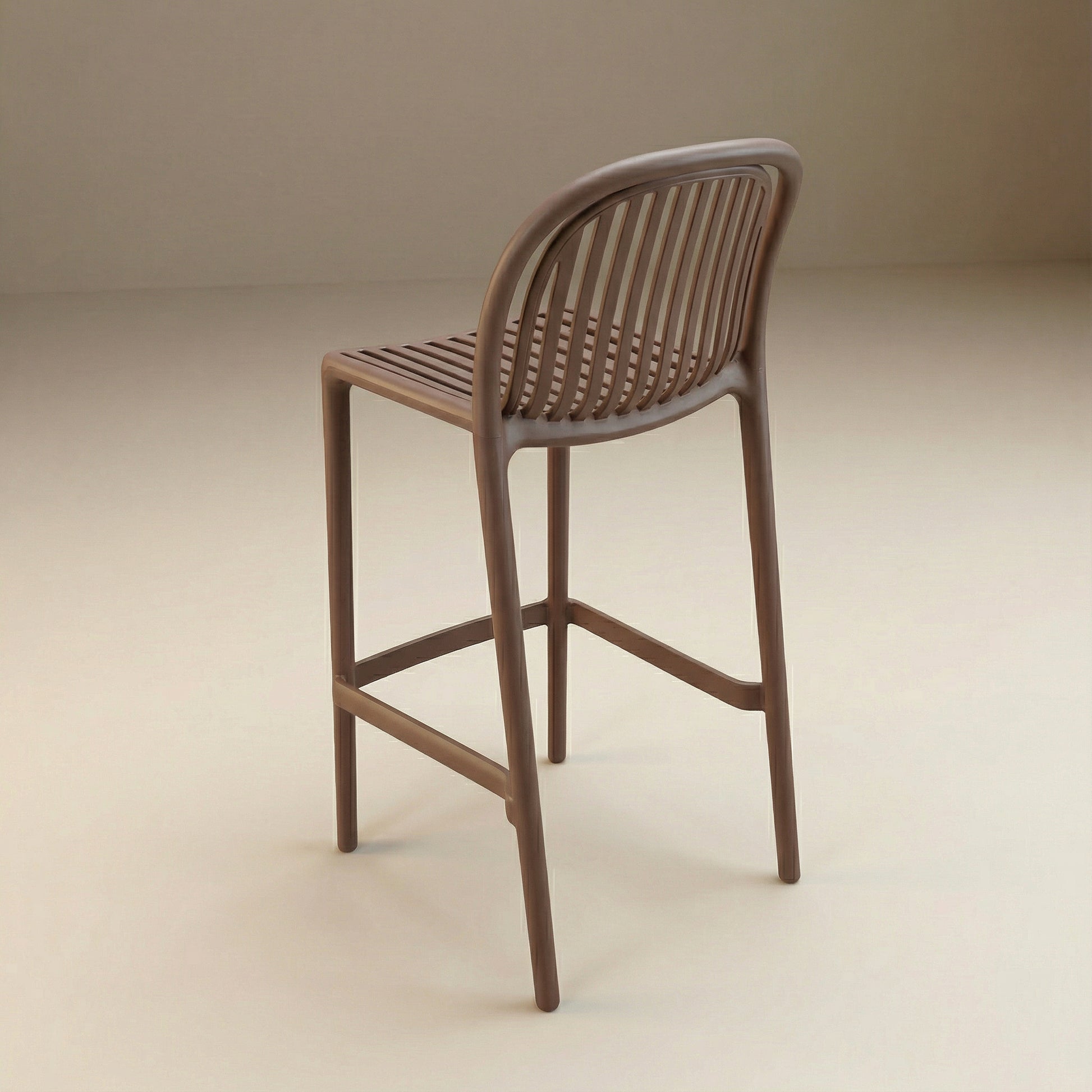 Su diseño de rejas en respaldo y asiento aporta una estética contemporánea y permite una óptima ventilación, brindando mayor confort en climas cálidos. El color marrón realza su apariencia limpia y versátil, facilitando su integración en terrazas, barras exteriores, áreas de piscina y espacios comerciales como bares y restaurantes.