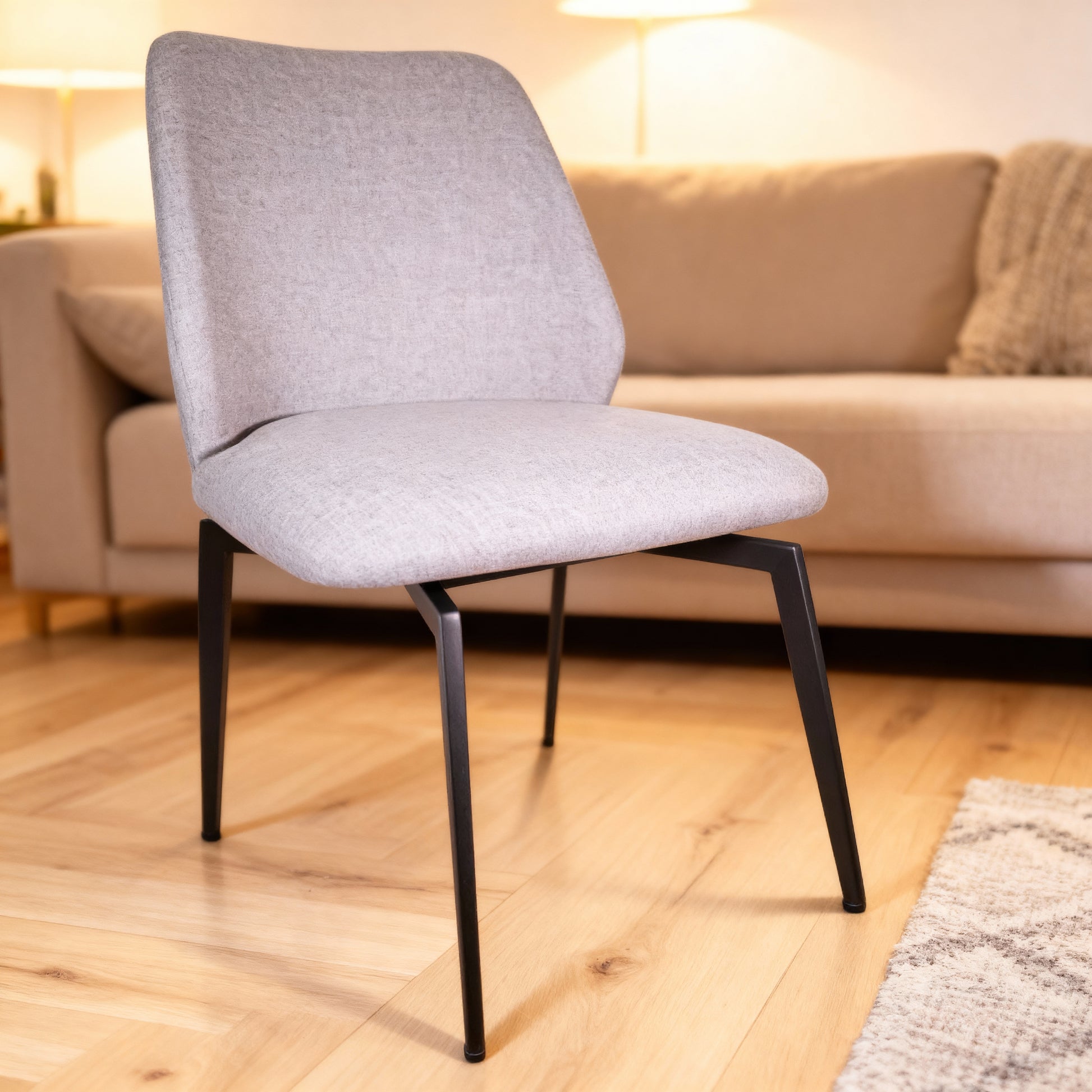 • Base Moderna en Contraste: Se apoya sobre unas patas metálicas oscuras (negras o gris grafito), que son esbeltas y angulares, creando un contraste elegante con el asiento claro y reafirmando su carácter contemporáneo de alta calidad.