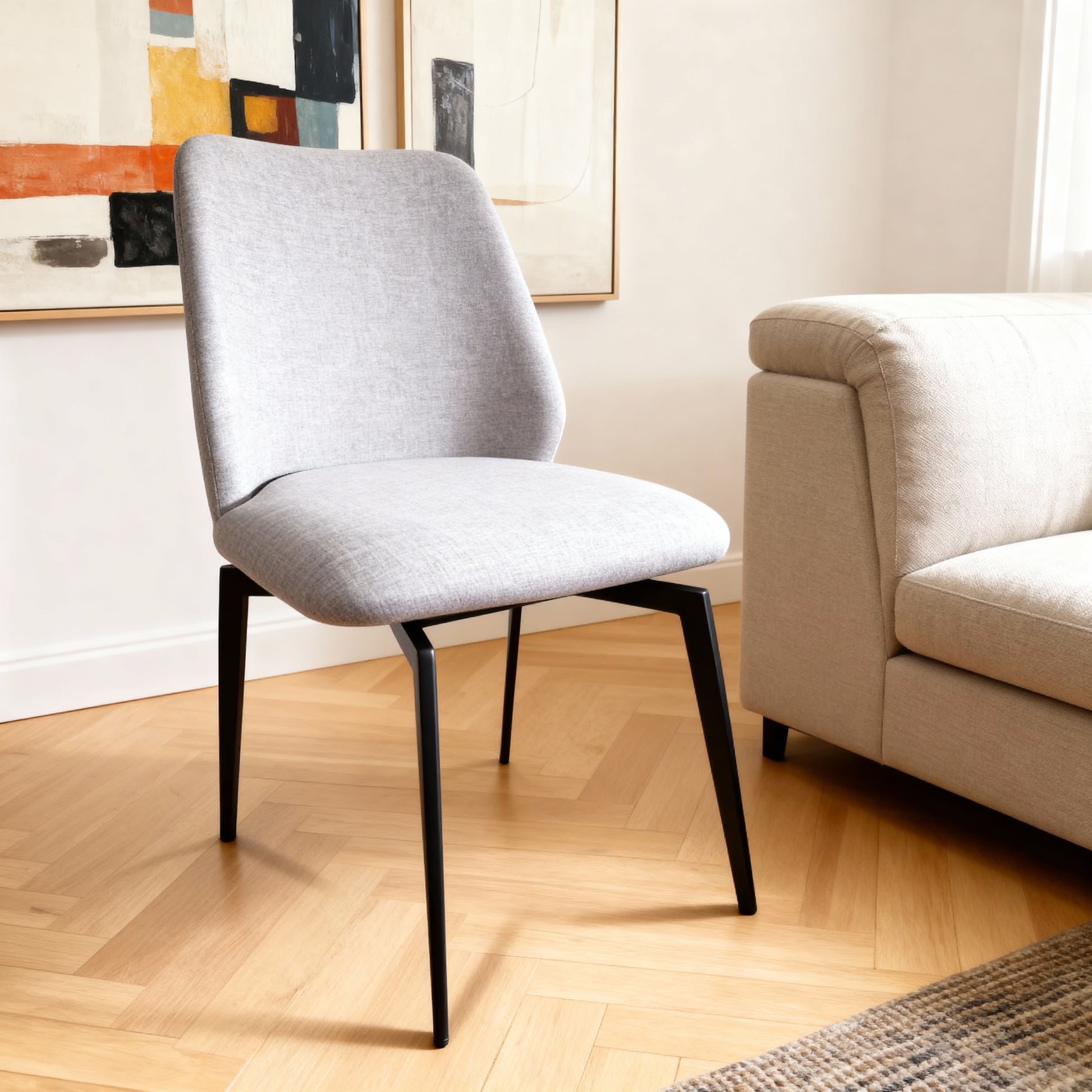 • Tapizado Contemporáneo: El asiento y el respaldo están totalmente tapizados en una tela de textura fina y duradera en un tono gris claro o ceniza, lo que le aporta una sensación de ligereza y modernidad.